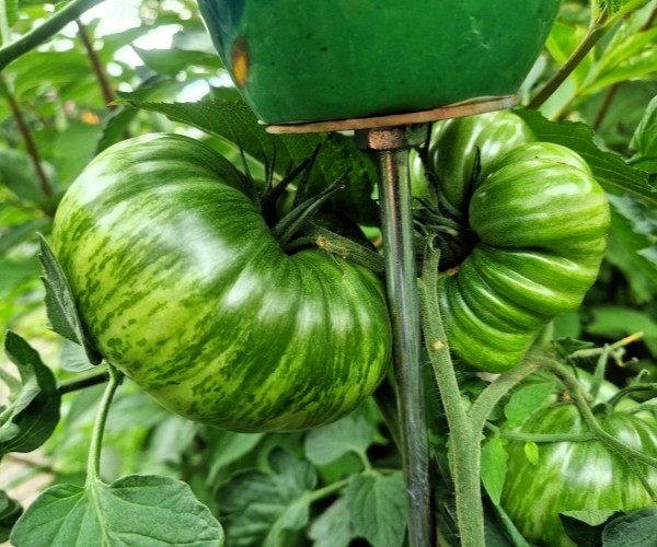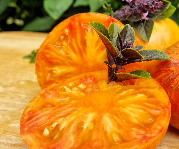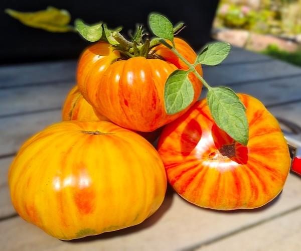 ‚Copia‘ ist eine wunderschöne leuchtend gelborangene Fleischtomate mit intensiv roten Streifen. Die Früchte sind leicht gerippt.