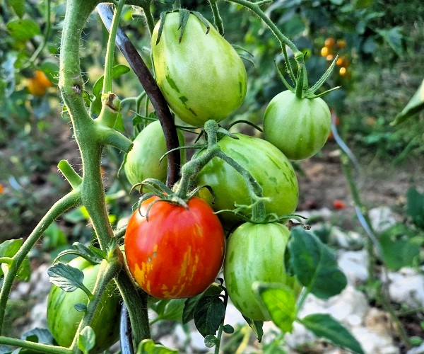 Die mittelgroße Tomatensorte ‚Russian Queen‘ ist wunderschön rot gelb orange gestreift.