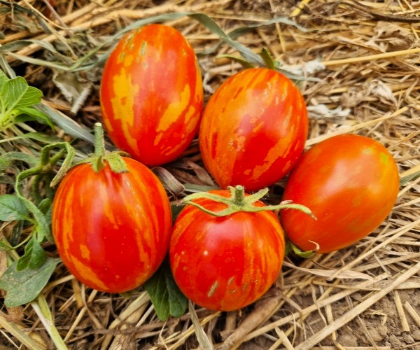 Die Früchte sind oval geformt und fest. Der Geschmack dieser schönen russischen Eiertomate ist intensiv würzig fruchtig – eine der geschmackvollsten gestreiften Salattomaten.